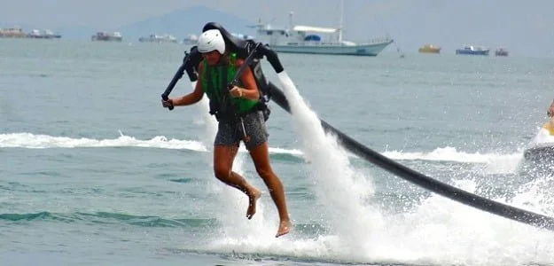 Experience the thrill of the water jetpack, also known as flyboarding, a unique water sport that allows you to soar through the sky with the aid of water jetpacks. This activity involves wearing specialized gear, including helmets and jetpacks, which propel you 10 to 15 meters above the water's surface. Those with previous experience can even execute daring stunts and manoeuvres for an added adrenaline rush.