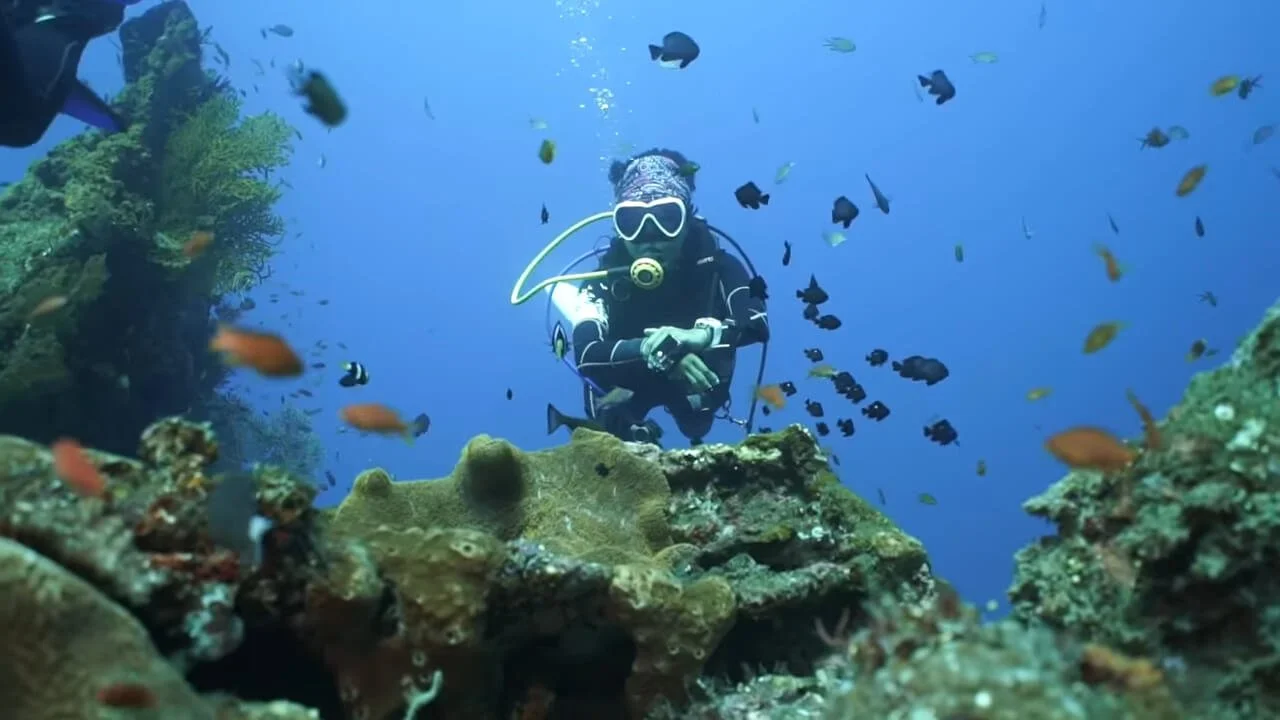 The sandy slope houses a variety of marine life, including cuttlefish, gobies, Decorated dartfish, Helmut Gurnard, Nudis, and Garden eels. The reef gradually slopes downward, providing a natural habitat for reef fish, Gorgonian sea fans, Pygmy seahorses, ghostpipe fish, octopus, lionfish, and scorpionfish. At greater depths, there are a plethora of sponges, including Barrel sponges, and is an ideal spot to observe reef sharks. The drop-off section features elephant-ear sponges, hard corals, and semi-permanent Napoleon wrasse. Rare sightings of Thresher sharks and Eagle rays have also been reported.